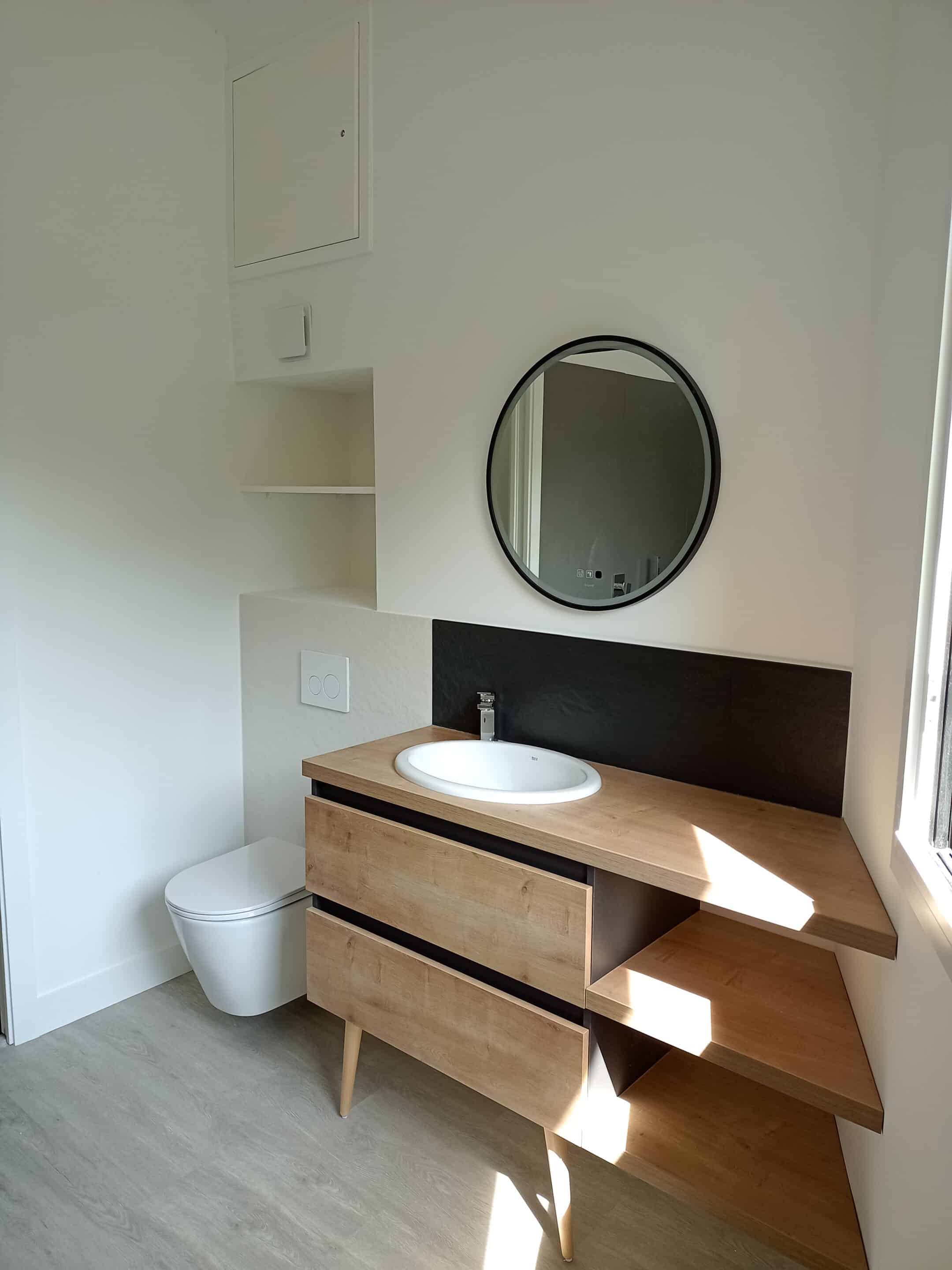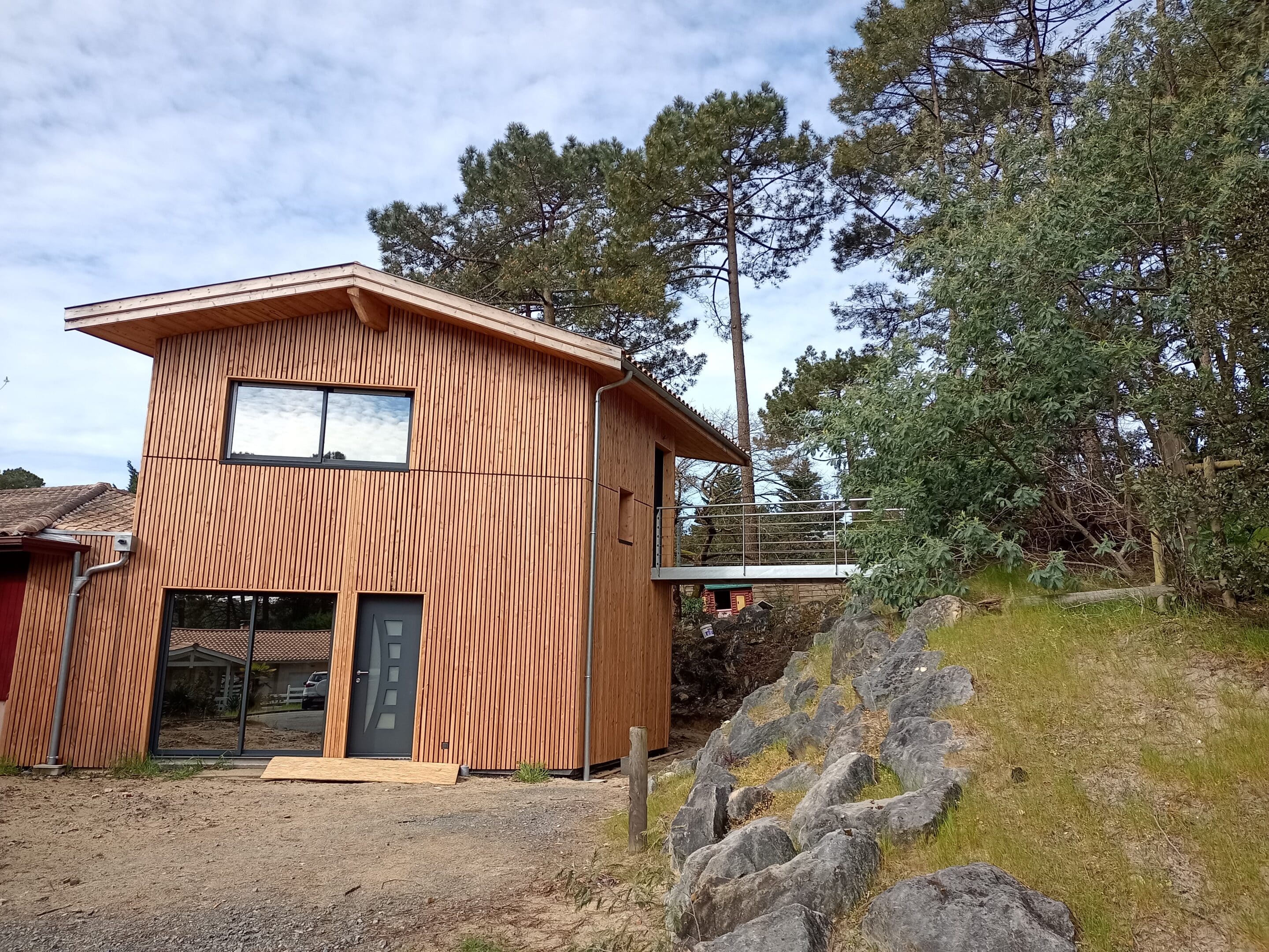 La forme de cette extension a été contrainte par l’enrochement, présent sur la parcelle, frontière visible marquant deux niveaux de terrain.