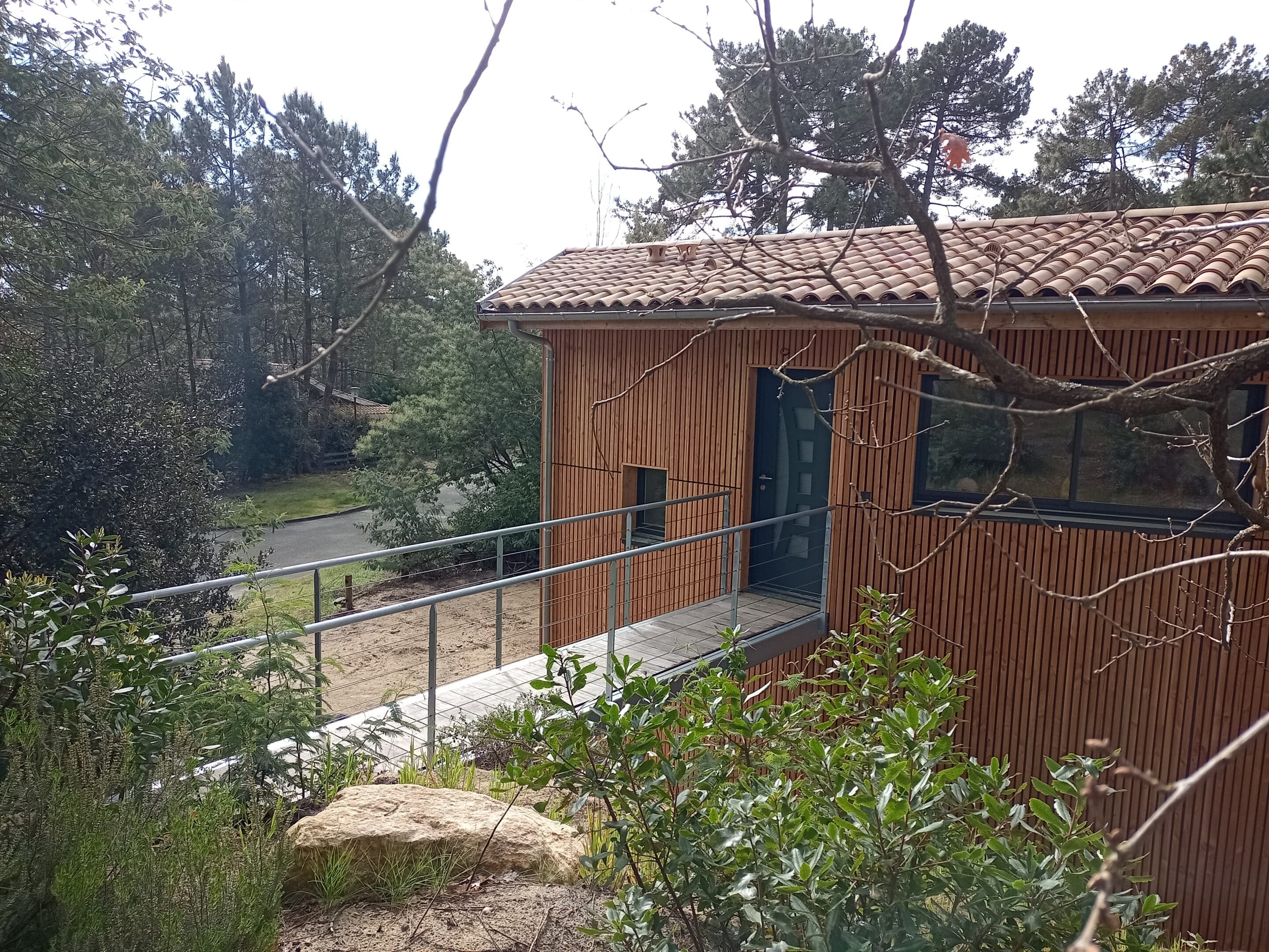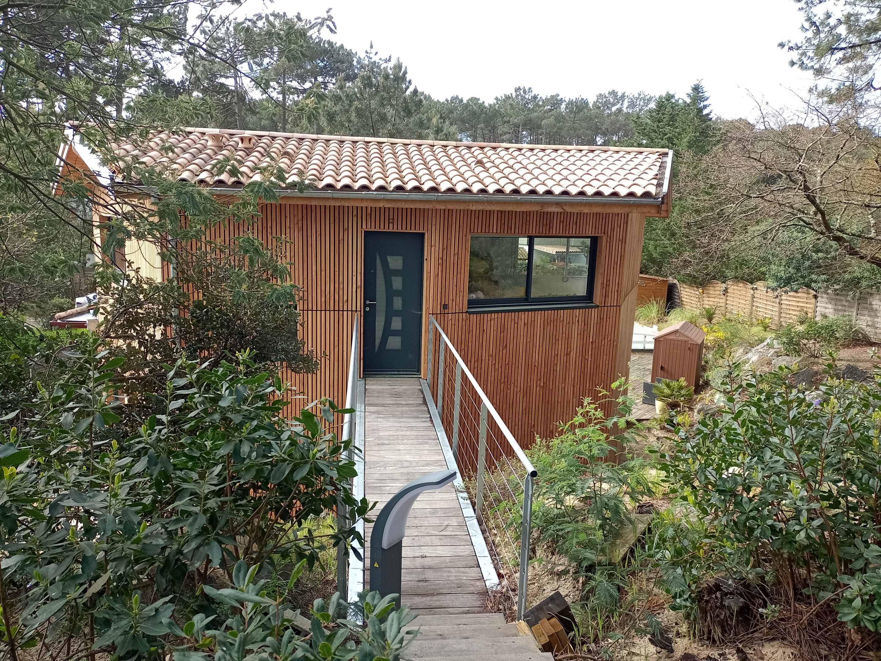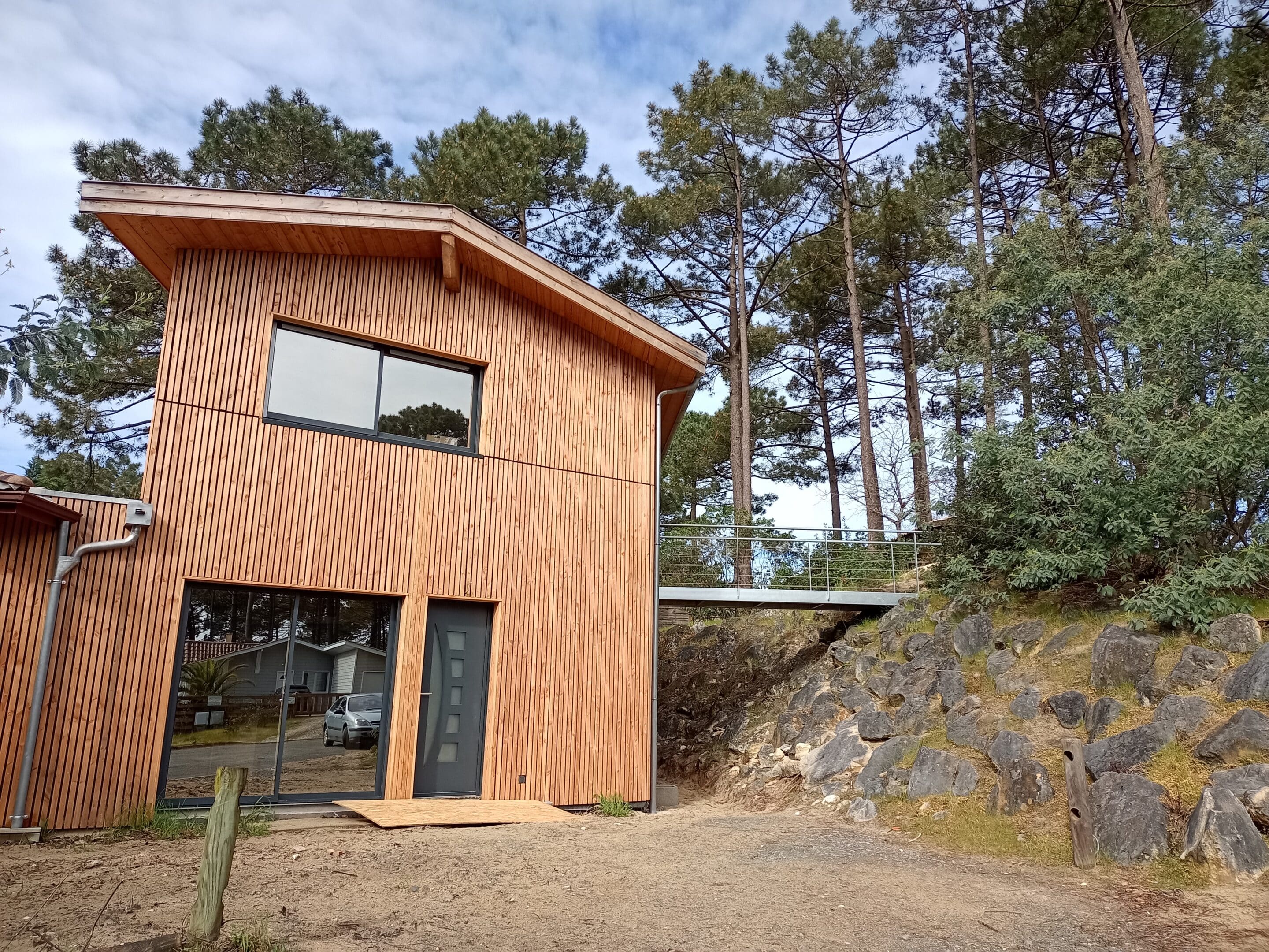 La réflexion s’est rapidement portée sur deux plateaux, à la fois liés par un escalier intérieur mais disposant aussi chacun de sa porte d’entrée : l’une située côté rue et l’autre, à l’étage, donnant sur une petite terrasse aménagée en cœur de pinède, accessible via une passerelle métallique. Cette passerelle fait ainsi la liaison entre les deux niveaux du terrain et participe à l’esthétique générale du projet.