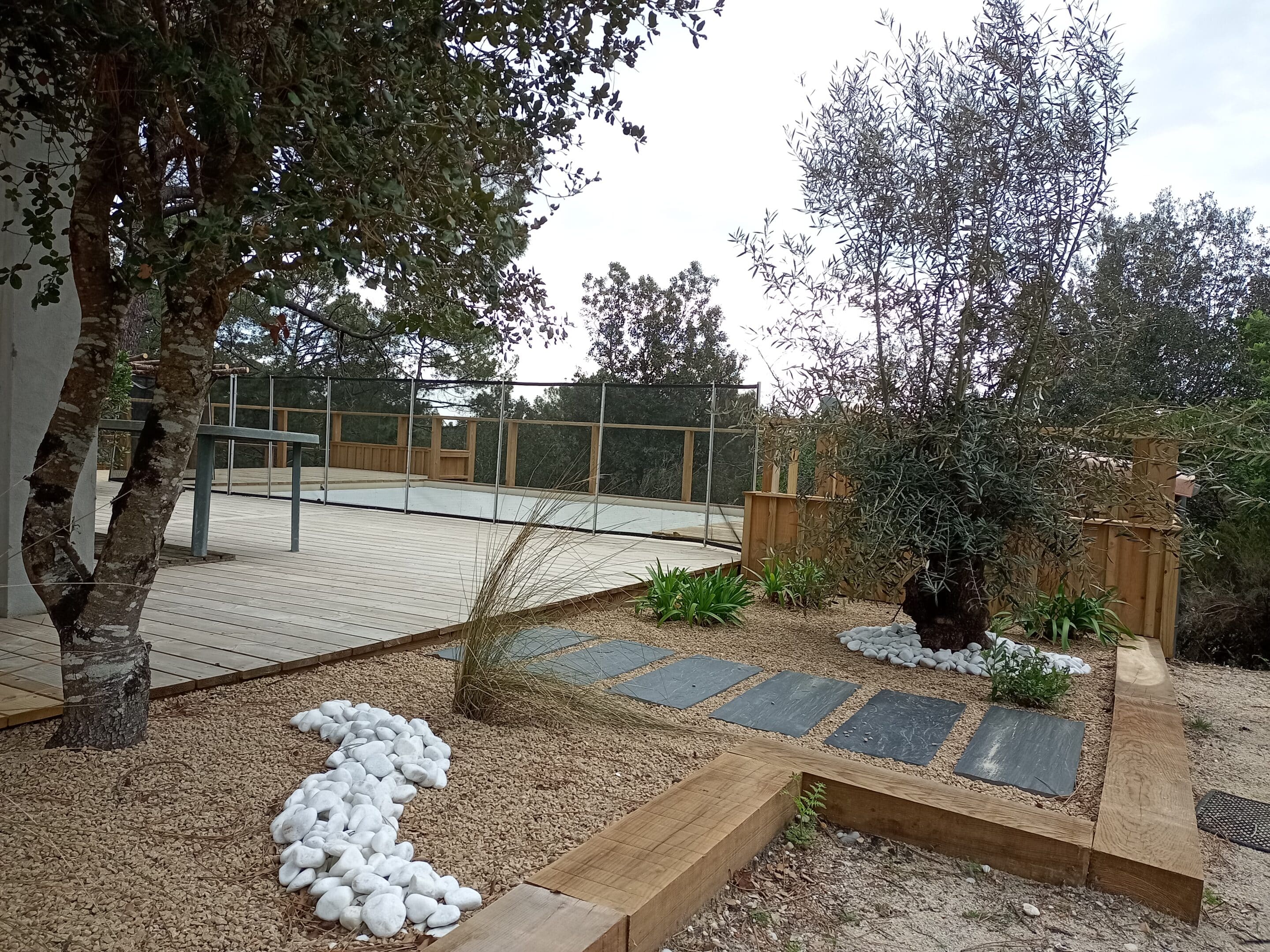 Nous en avons profité pour installer une cuve enterrée de 10 000 litres récupérant l’eau de pluie et permettant d’assurer les besoins de la piscine sans utilisation d’eau potable.