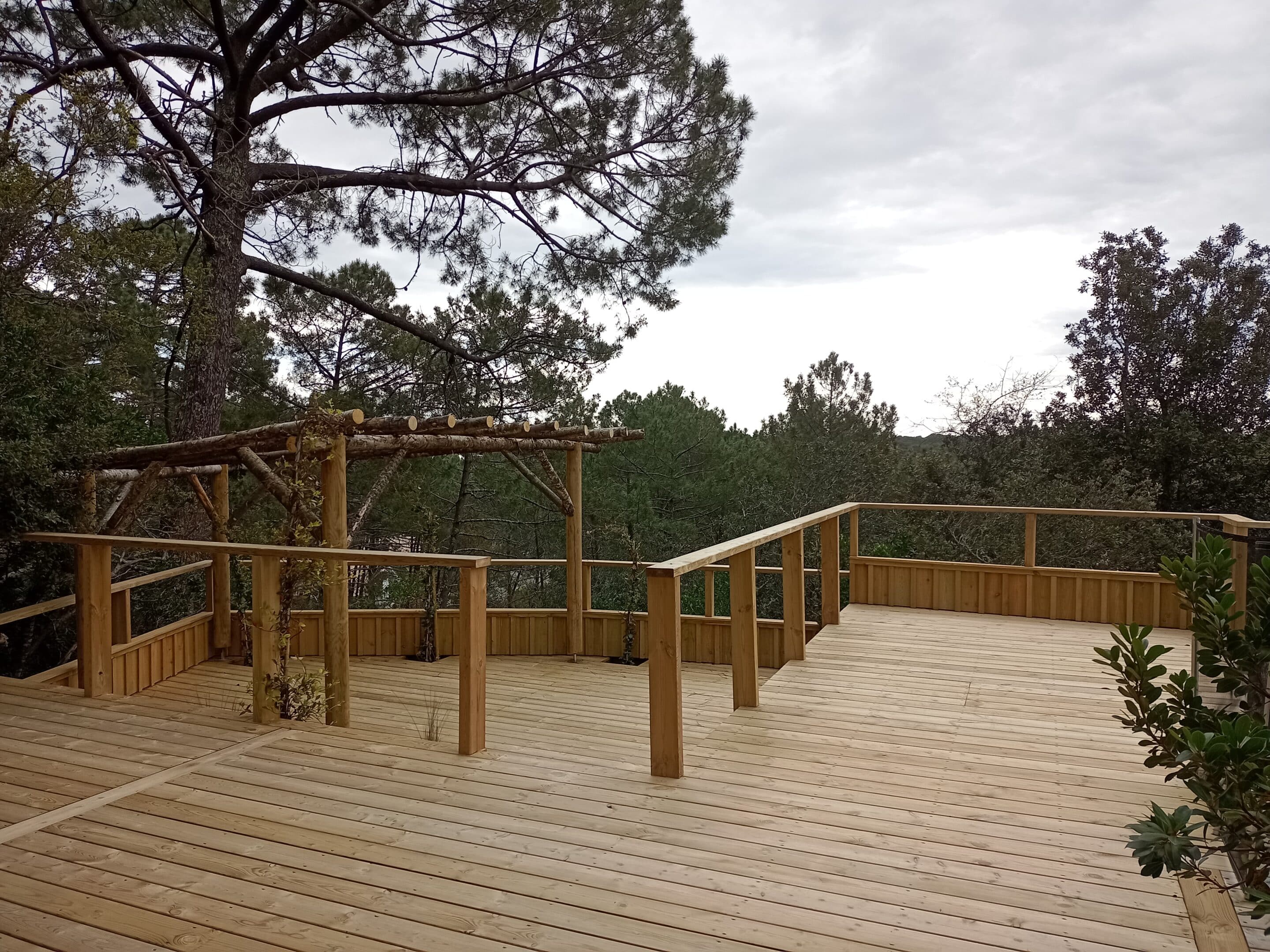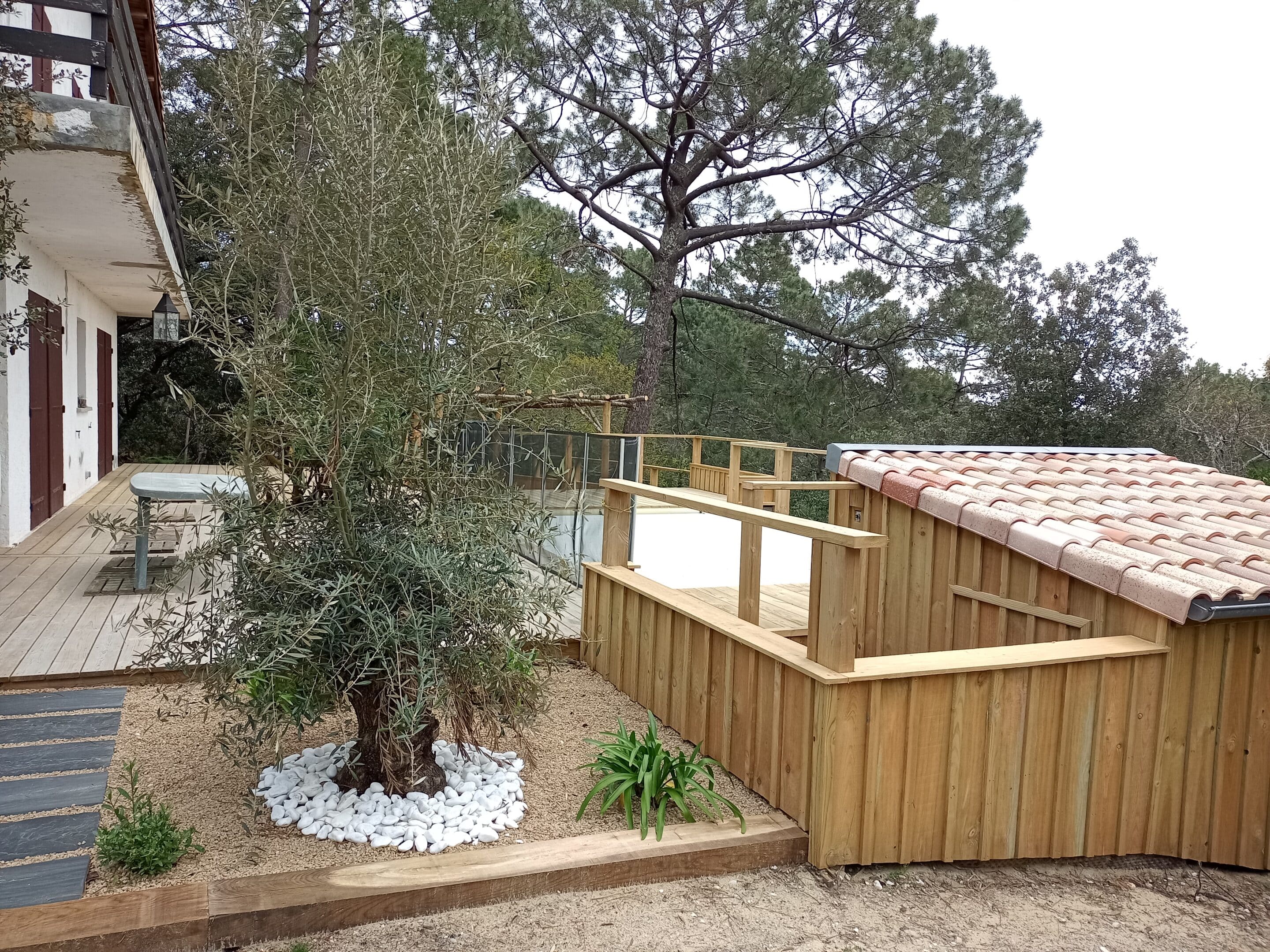 La réalisation de niveaux de terrasses est apparue comme une évidence en cours de travaux, permettant l’aménagement d’espaces paysagers tout en préservant la vue privilégiée sur la forêt.